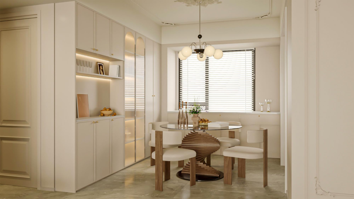 Modern dining storage cabinets or credenzas anchor the room visually while adding functionality.